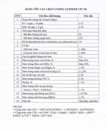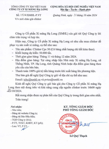 Thông báo mời cháo giá clinker tháng 11 - 12/2024