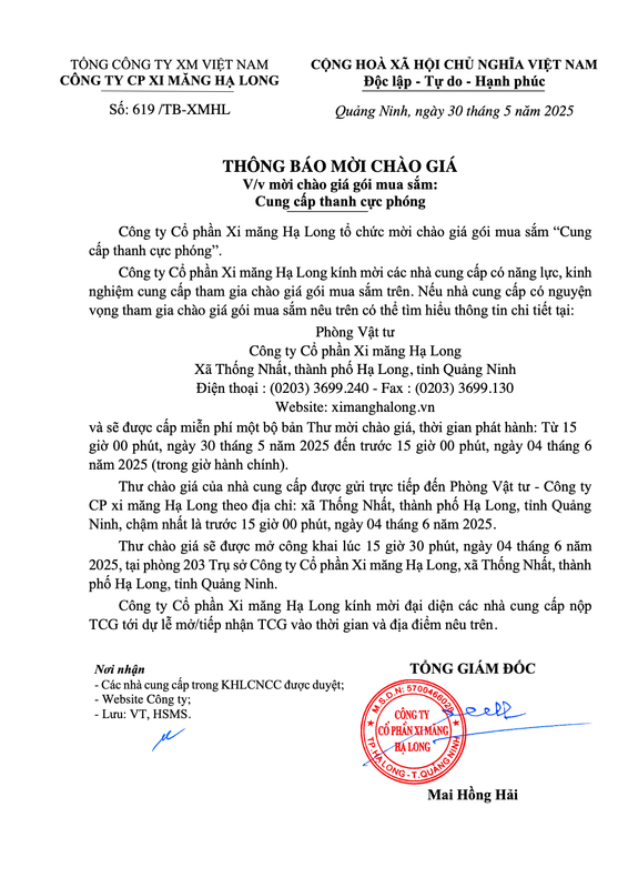 Thông báo mời chào giá gói mua sắm Cung cấp thanh cực phóng