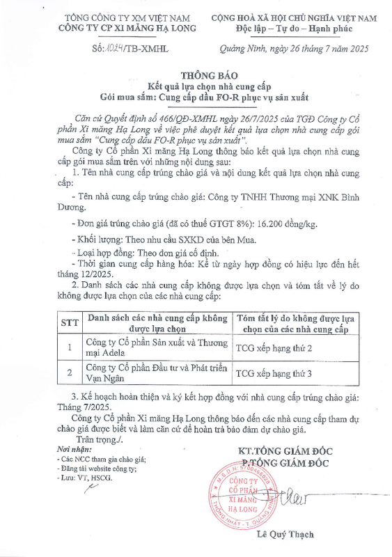 Thông báo KQLCNCC gói mua sắm Cung cấp dầu FO-R phục vụ sản xuất