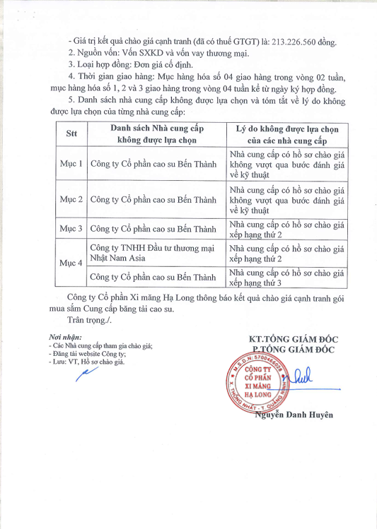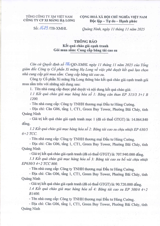Thông báo KQLCNCC gói mua sắm Cung cấp băng tải cao su