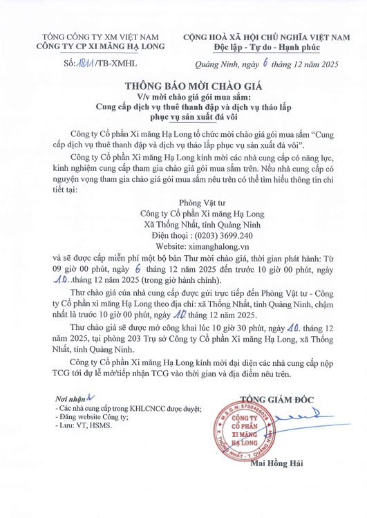 Thông báo mời chào giá gói mua sắm Cung cấp dịch vụ thuê thanh đập và dịch vụ tháo lắp phục vụ sản xuất đá vôi