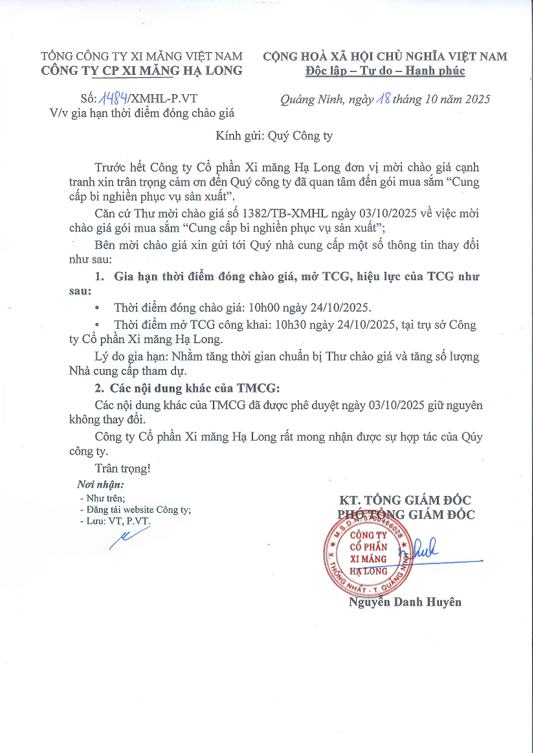 Gia hạn thời điểm đóng chào giá gói mua sắm Cung cấp bi nghiền phục vụ sản xuất