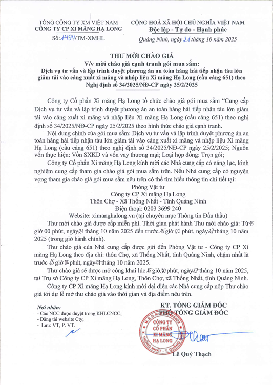 Thư mời chào giá cạnh tranh gói mua sắm Dịch vụ tư vấn và lập trình duyệt phương án an toàn hàng hải tiếp nhận tàu lớn giảm tải vào cảng xuất xi măng và nhập liệu XMHL