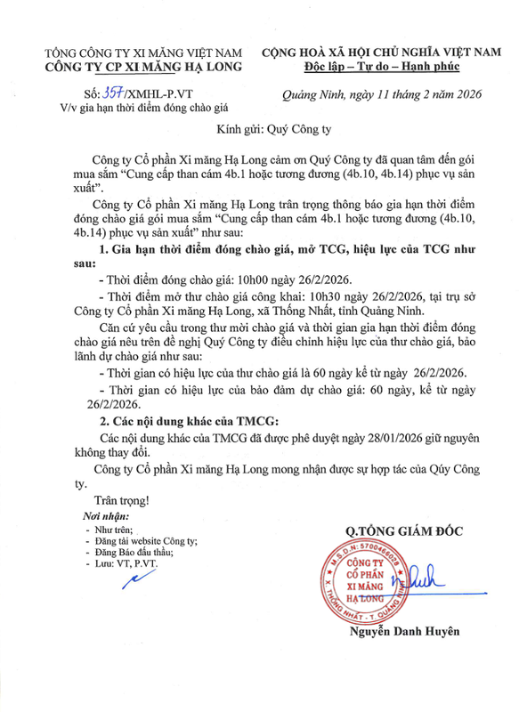 Gia hạn thời điểm đóng chào giá gói mua sắm Cung cấp than cám 4b.1 hoặc tương đương (4b.10, 4b.14) phục vụ sản xuất