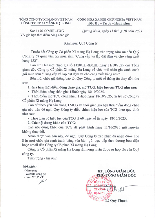 Gia hạn thời điểm đóng chào giá gói mua sắm Cung cấp và lắp đặt đệm va cho cảng xuất hàng 482