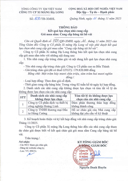 Thông báo KQCGCT gói mua sắm Dịch vụ san tẩy, bắt dây tàu clinker, xi măng trong quá trình bán hàng