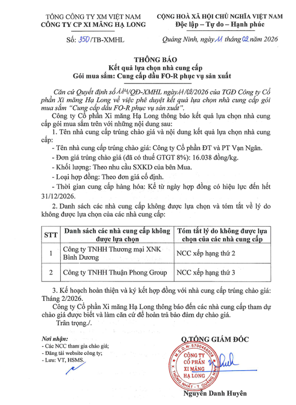 Thông báo KQLCNCC gói mua sắm Cung cấp dầu FO-R phục vụ sản xuất