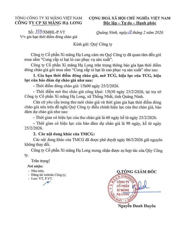 Gia hạn thời điểm đống chào giá Cung cấp xỉ hạt lò cao phục vụ sản xuất